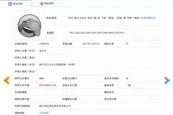 去年9月,有人发现这个“捂脸”表情竟然被抢注为商标了。中国商标网信息显示,该商标的申请人名叫金召平。商标的核定使用商品/服务项目为第25类,涵盖服装、婴儿全套衣、鞋帽袜、领带围巾等。