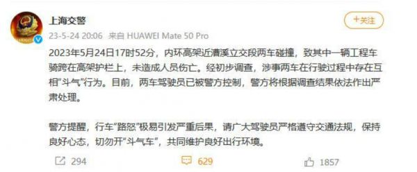5月24日晚,上海交警部门发布通报称,当日17时52分,内环高架近漕溪立交段两车碰撞,致其中一辆工程车骑跨在高架护栏上,未造成人员伤亡。经初步调查,涉事两车在行驶过程中存在互相“斗气”行为。目前,两车驾驶员已被警方控制,警方将根据调查结果依法作出严肃处理。