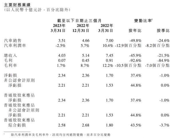 此外,一季度净亏损为人民币23.4亿元,较2022年第四季度的人民币23.6亿元减少1.0%。一季度毛利率为1.7%,公司解释称:同比和环比减少主要由于销售促销增加和新能源汽车补贴届满所致。