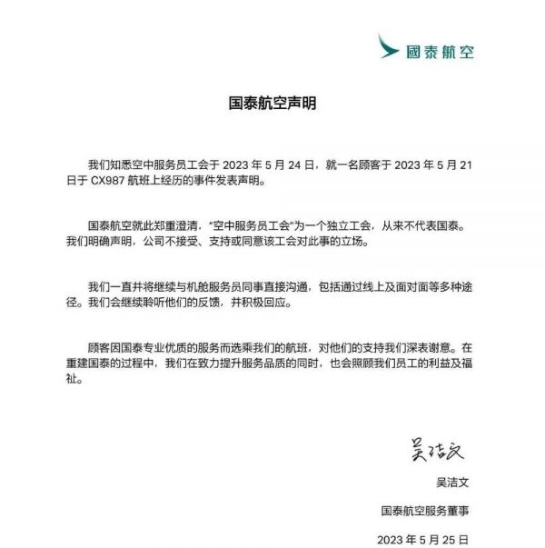 今天下午又看到国泰航空发布的最新声明,表示“空中服务员工会”为一个独立工会,从来不代表国泰。我们明确声明,公司不接受、支持或同意该工会对此事的立场。