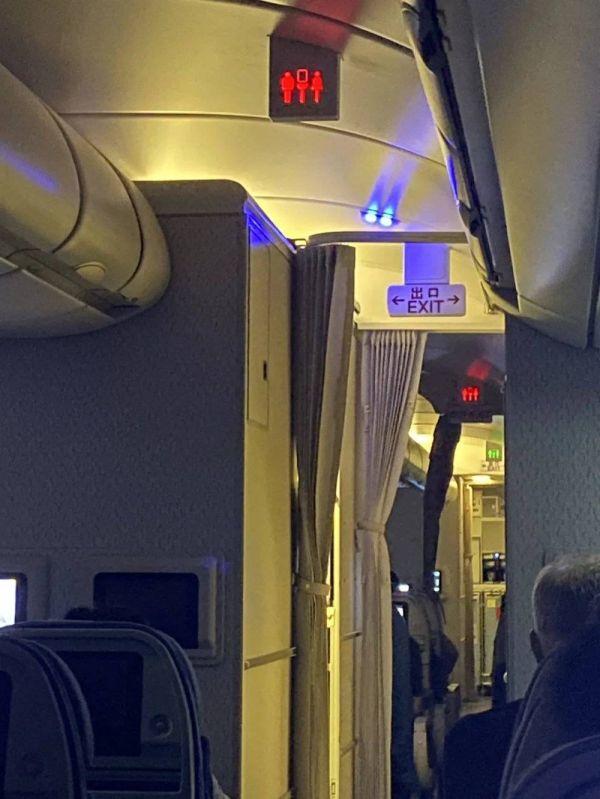 然后我便“巡视客舱”,走到了最后一排。很有趣,从前往后走,裹着毛毯的绝大部分都是男士,有年轻人,也有两米高的白人壮汉(候机楼见过)。回来的时候我又慢慢观察了一下,大多数女士们都穿着小外套,大概因为男士心思没有那么细,不会想着带外套的缘故?