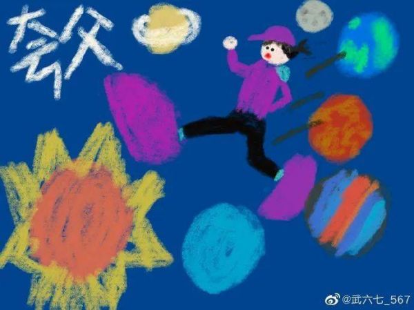 这是武六七给网友画的一幅蜡笔画,跨越的动作被想象成了夸父逐日。(图/微博@武六七-567)