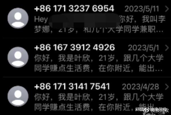 许多苹果手机用户反馈这些信息大部分是声称在校大学生找兼职或是全职太太急需用钱的借口,能够提供成人服务。传输这类信息的方式主要包括iMessage形式。而且,接收短信的消费者不分性别。