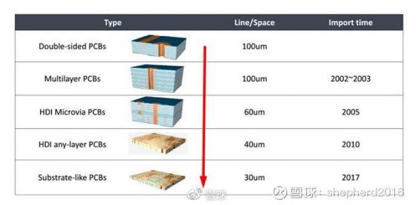 PCB板也逐渐演化为复杂结构。目前,PCB从早期的单层/双层、多层板,向HDI,以及目前火热的类载板方向升级产品线宽线距逐渐缩小。HDI对比传统PCB可以实现更小的孔径、更细的线宽、更少通孔数量,节约PCB可布线面积、大幅度提高元器件密度和改善射频干扰/电磁波干扰等。SLP,相较于HDI板可将线宽/线距从HDI的40/50微米缩短到20/35微米,同样面积电子元器件承载数量可以达到HDI的两倍,已在苹果、三星等高端手机产品中使用。
