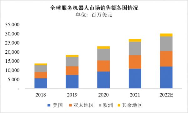 而机器人另一重要分类——服务机器人则以美国为主导,在2021年全球近270.74亿美元的服务机器人市场销售额中,美国以108.54亿美元占据了40.09%的比例。