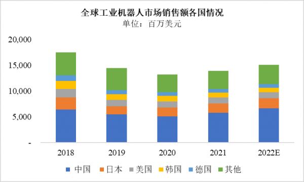 在全球机器人分类中,作为两大分类之一的工业机器人2021年的市场销售额近139.23亿美元,以中国为主导国家,其次才是日美韩德等国家。