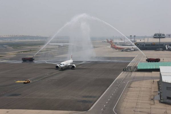 5月28日,C919大型客机顺利抵达北京首都国际机场后穿过“水门”,图片:视觉中国