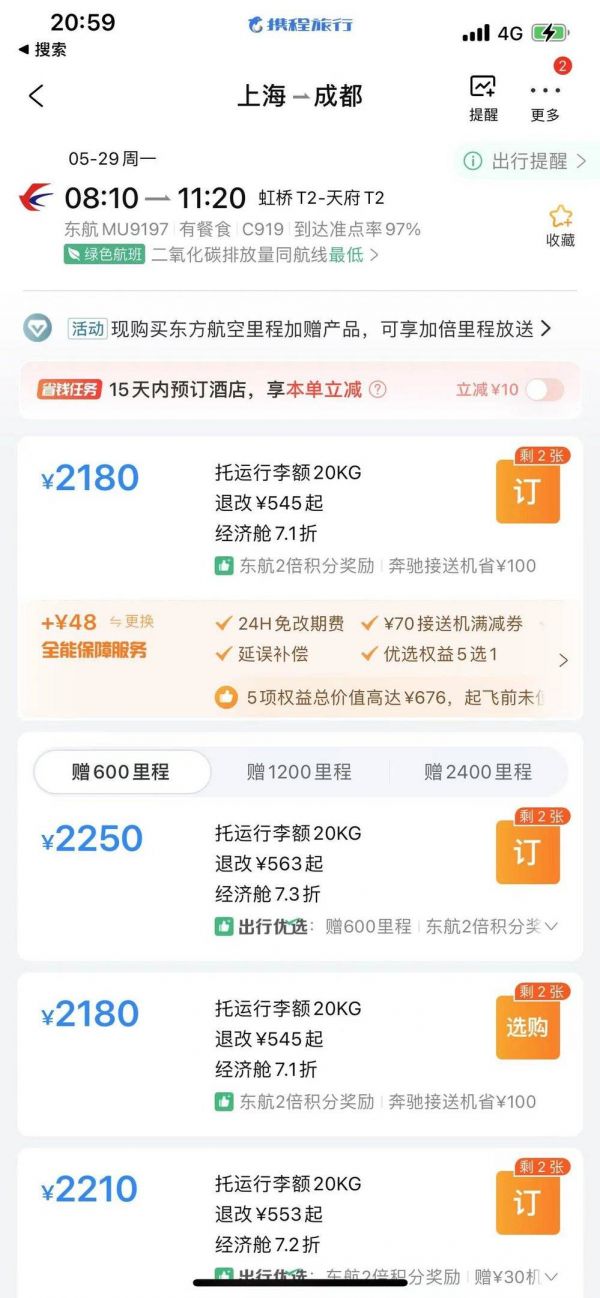在28日完成首次商业载客飞行后,从5月29日开始,东航首架C919大型客机将在上海虹桥-成都天府航线上实行常态化商业运行,最早一趟航班将于5月29日早上8:10执行,航班号MU9197,截至28日晚9点,只有2张经济舱可选,售价高达2180元,据悉,最初售价只有900余元。可见,想体验C919大飞机的乘客非常多。