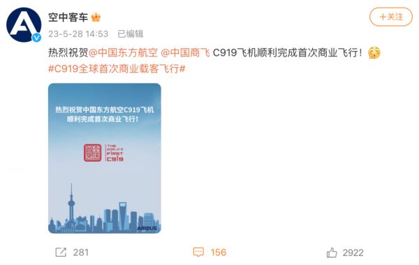 在C919商业首航成功后,波音和空中客车在微博上第一时间送上了祝福: