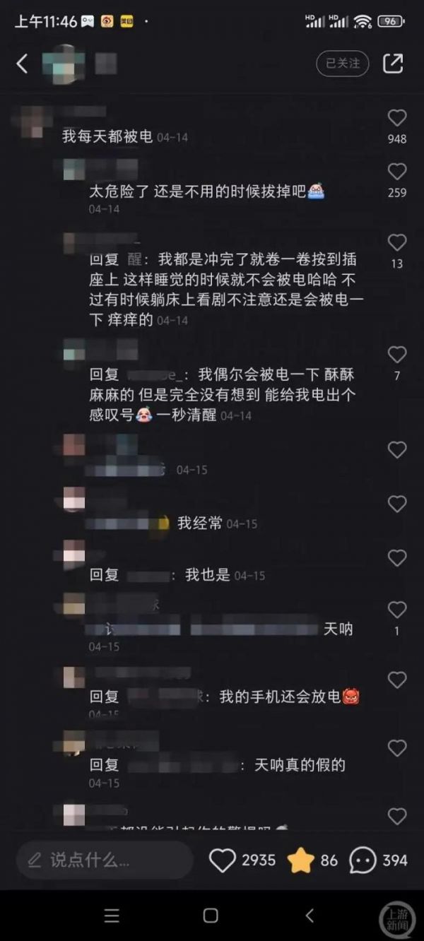 多名网友表示有被电到的经历。/截屏就博主“醒”睡觉被充电插头电伤的情况,技术代表建议:“为了避免这种情况发生,建议睡觉时充电线远离床铺,或者不充电时把充电器拔掉。”