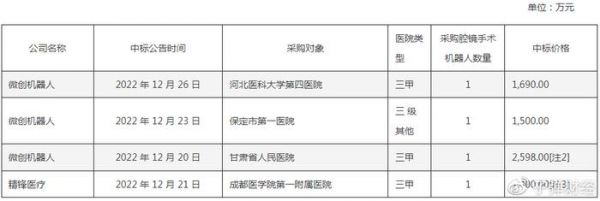 在问询函中,思哲睿表示2023年一季度有望实现设备销售收入。2022年思哲睿康多机器人SR1000中标黑龙江中医药大学附属第一医院腹腔内窥镜手术系统采购项目,中标价格为538万。