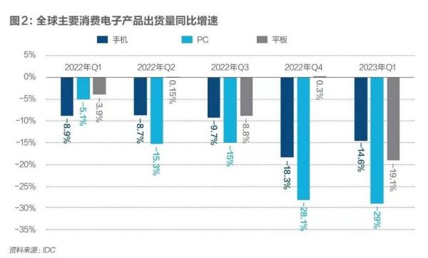 全球消费电子行业低迷已超过三年。市场研究机构IDC数据显示,2023年一季度,全球智能手机、PC、平板电脑的出货量同比分别下滑了14.6%、29%和19.1%。
