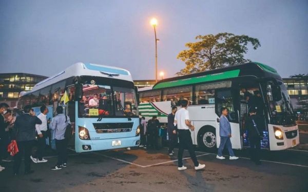 规模庞大的中国考察团需要三辆大巴车才能装下。供图/主办方“中印越电子(手机)企业协会”