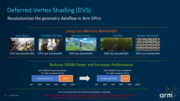 Immortalis G720 的最大创新是引入了延迟顶点着色(DVS)技术,这是一种可以减少内存访问和带宽使用的方法,从而节省功耗和提高帧率。据 Arm 称,高性能游戏中有三分之一的功耗来自内存访问,而 DVS 可以将带宽使用降低 40%。与去年的 Immortalis G715 相比,Immortalis G720 的每瓦性能提高了 15%,峰值性能提高了 15%,帧速率平均增加 15%。在实际性能中,Arm 测得的性能比 Immortalis G715 提高了 20%,其中很大一部分可归因于 DVS 节省的带宽。这意味着移动平台可以实现更沉浸、更高级的游戏效果,甚至可以支持 PC 级别的特效,如实时动态光照、泛光、景深和屏幕空间环境光遮蔽等。事实上,虚幻引擎 5 的桌面渲染器也将在今年晚些时候登陆安卓平台。