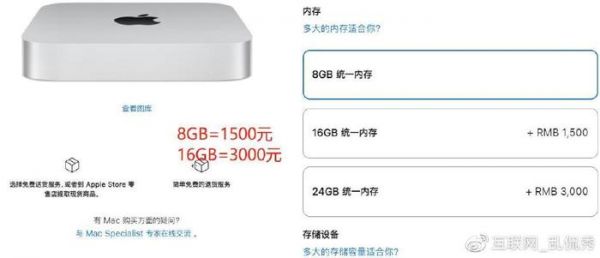 如果你要从8G内存,升级成24GB,也就是多了16GB内存,需要加3000元,苹果的16G内存=3000元,与上面的8GB=1500的比例是一样的。