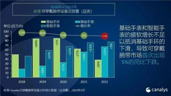 整个2022年整体来看,基础手环已经下跌了39%,与之相反的是,智能手表增长了3%,基础手表增长了21%。