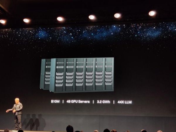 英伟达在展会上展示了一份 LLM 的总体拥有成本(Total Cost of Ownership,TCO)分析:首先,他们计算了训练一个 LLM 所需的 960 个 CPU 组成的服务器集群的完整成本(包括网络、机箱、互连等所有设备),发现这需要花费约 1000 万美元(IT之家备注:当前约 7070 万元人民币),并消耗 11 千兆瓦时的电力。