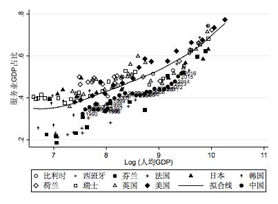 注:根据ISIC划分三大产业,同Maddison Project Database。其中,第一产业是指农业、林业、畜牧业、渔业和农林牧渔服务业。第二产业是指采矿业,制造业,电力、煤气及水的生产和供应业,建筑业。第三产业是指除第一、二产业以外的其他行业。本文用第三产业GDP占总GDP比重计算服务业GDP占比。拟合线是指除中国外的其他10个国家的Lowess拟合线。此图转引自:钟粤俊、陆铭、奚锡灿,2020,《集聚与服务业发展:基于人口空间分布的视角》,《管理世界》,第11期,第35-47页。