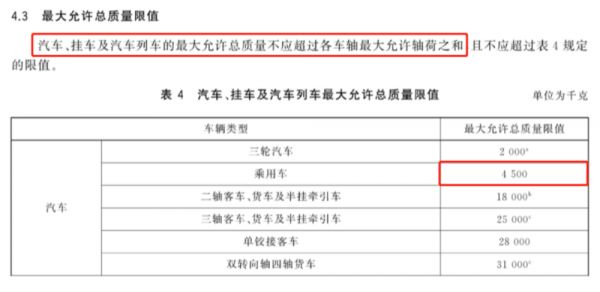 GB 1589-2016《汽车、挂车及汽车列车外廓尺寸、轴荷及质量限值》中有提到:乘用车最大允许总质量为4500kg。