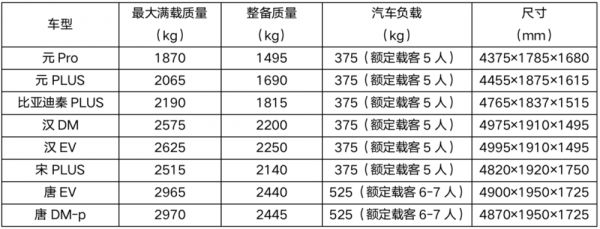 比如比亚迪明显采用了根据座位数来制定最大满载质量的思路——75kg/人。下表中,可以看到这些车型都是根据额定载客人数来计算负载。基于这个原则,加上整备质量后,就是最大满载质量了。