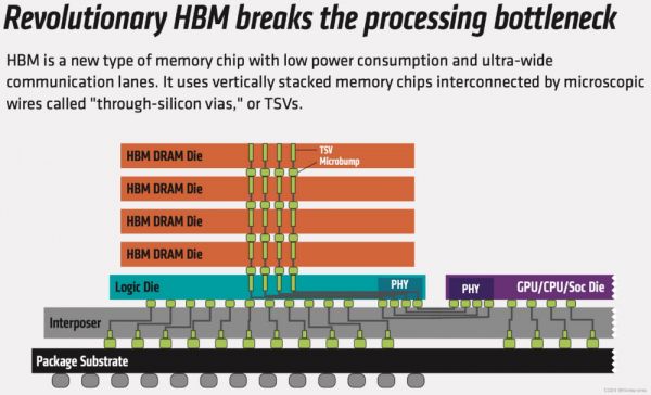 它将很多个DDR芯片堆叠在一起后和GPU封装在一起,实现大容量、高位宽的DDR组合阵列,不同层的Die之间用TVS(硅通孔)方式连接。片上HBM的出现使AI完全放到片上成为可能。在提升集成度的同时,还使带宽不再受制于芯片引脚数量限制,在一定程度上解决了IO瓶颈。