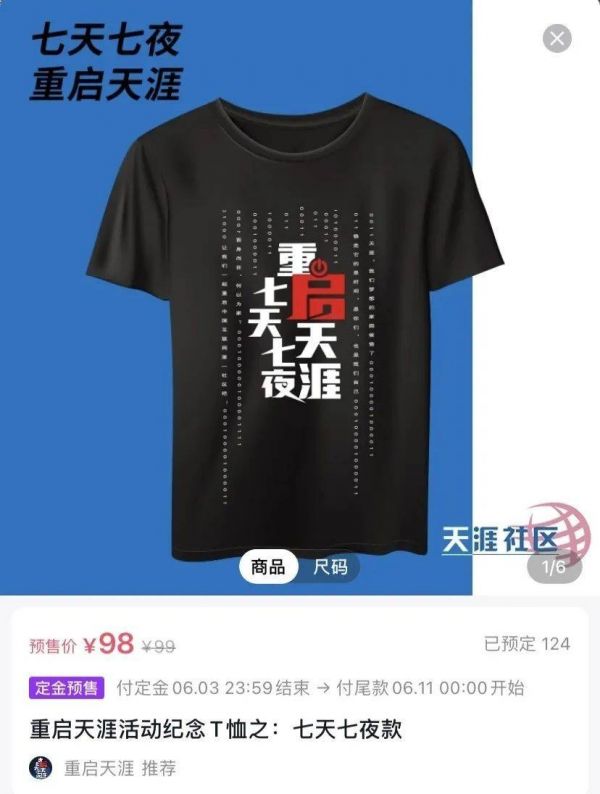 以“七天七夜 重启天涯”为主题的纪念T恤,售价99元,定金15元,截至29日零点,只售出了120余件。