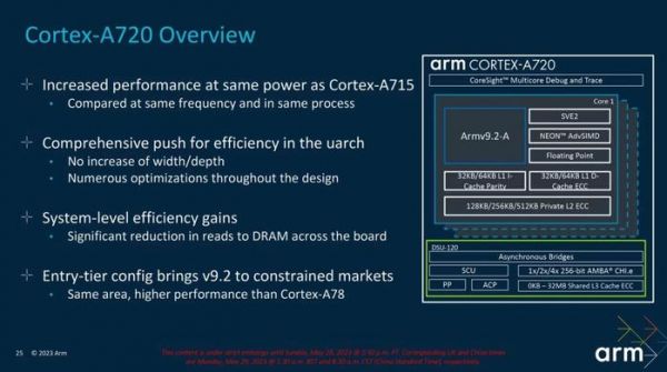 Cortex-A720 是最新的性能核心,在与去年的 A715 相同的功率下,核心的效率提高了 20%,性能也有所提高。同时 A720 核心在前端也做了一些改进,例如缩短了流水线长度,优化了分支预测,以及流水化了浮点除法和平方根运算。