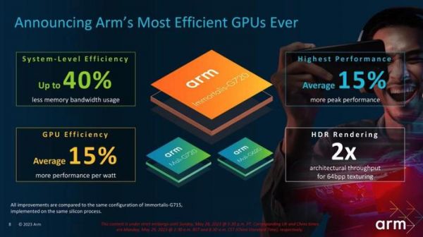 根据 Arm 公司公布的信息,Cortex-X4 核心比去年的 X3 核心性能平均提高了 15%,同时在相同频率下降低了 40% 的功耗,并且该核心物理尺寸增大了不到 10%,是有史以来最高效的 Cortex-X 内核。