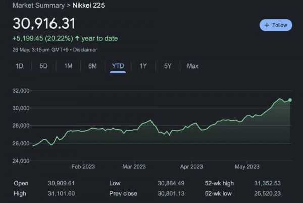 日本第一季度GDP同比增长1.6%,跑赢预期0.7%和前值-0.1%。两周前,日经指数在GDP数据公布后升破30000点,创下2021年9月以来的新高。东证TOPIX指数则创下1990年资产泡沫破裂以来的最高水平。截至5月25日收盘,日经225指数报30,916.31点,年内涨幅20.22%。