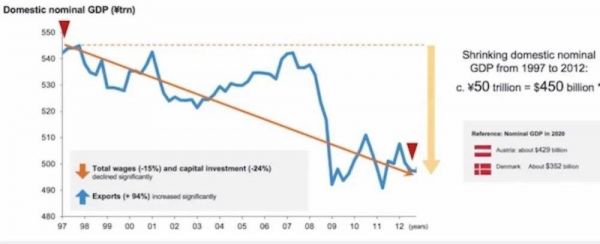 数据显示,日本经济从1997年到2012年急剧萎缩,GDP从1997年的550万亿日元附近下跌到2012年的500万亿日元附近。50万亿日元(约合4500亿美元)的萎缩幅度超出了奥地利(4290亿美元)和丹麦(3520亿美元)的GDP。