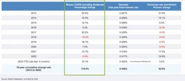 每每谈起日本,“失去的30年”“低欲望社会”“通缩”等词,似乎成了人们话语里的条件反射,然而很多人可能不知道,过去十年日本股市(东证券TOPIX指数,截至2022年底)的累计涨幅高达174%,即使计入日元的巨大贬值幅度,折合美元的回报率也有近60%,相比之下日本存款利率接近于0。