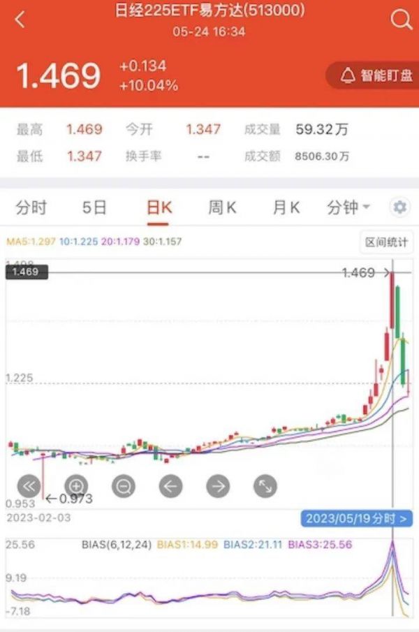 事实上,过去一周以来,国内挂钩日本股市的ETF和QDII基金亦受到空前关注。5月23日,两只挂钩日经225的ETF,由于超高的溢价率而再度暴跌。其中易方达的日经225ETF(513000)上周一、上周二分别下跌9.87%、7.48%,两日合计下跌17.35%;华夏的日经225ETF(513520)则合计下跌14.44%。