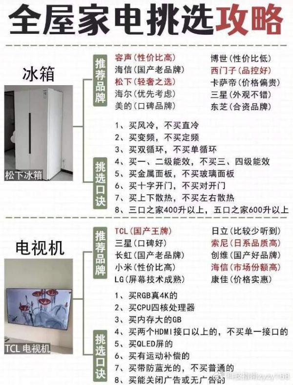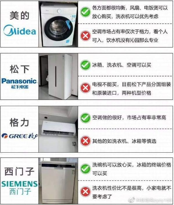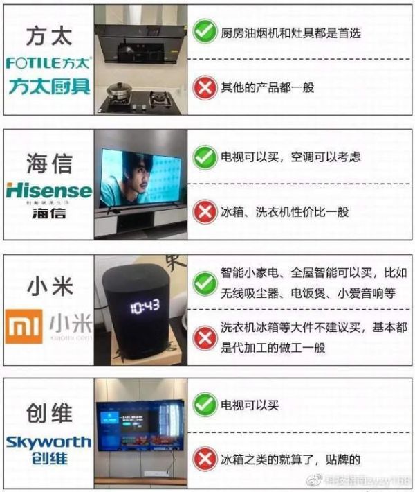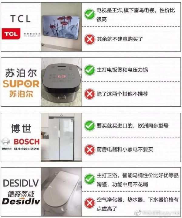 大家注意看文章图片中,已经明确给大家推荐了各个品牌哪些家用电器可以买,而哪些需要谨慎选择了,并给大家提供了一张攻略图。