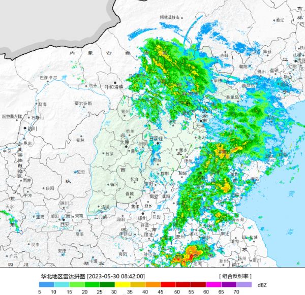 河南雨势渐停,雨带转向东部其他省份,对河北、山东、安徽夏粮抢收产生考验。(图/中国气象局雷达气象中心)