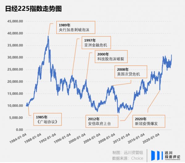 今年以来,英国富时100创下历史新高,法国CAC40创下历史新高,但是说到日本,就必须加上“自1990年以来”这个限制。1989年12月29日,日本泡沫经济助推日经225来到历史最高点38916点,此后泡沫刺破,随着众所周知的资产负债表衰退和长期低迷的通胀,日本股市也进入了半死不活的状态。