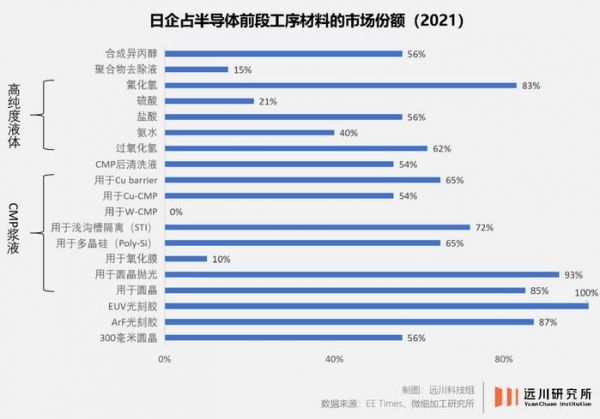 在基础科学领域也是一样,根据远川研究所的报告,日本即便到现在,在半导体材料市场都拥有着几乎统治级的市场占有率。其中,像EUV光刻胶、高纯度氟化氢材料等在市场中甚至很难找到替代品。