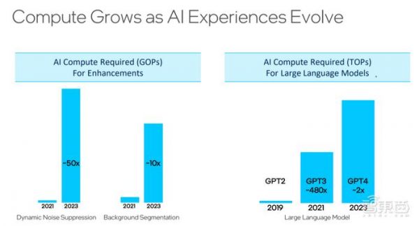 同时,AI技术的进步、处理复杂度的提升也带来了算力需求的大幅上涨,比如噪音抑制处理与两年前相比复杂度有50倍提升,生成式AI模型对算力的需求又上了新的台阶,GPT-4的业内预测参数量是万亿级。这些对硬件厂商提出了新的挑战。