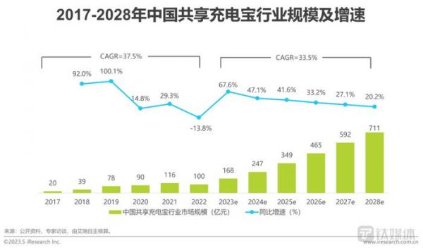 图片来源:艾瑞咨询今年,随着居民生产、生活等经济活动的稳步恢复,共享充电宝也随着行业的景气而回暖。艾瑞咨询预测,2023年行业容量有望增至168亿,并于2028年超过700亿规模。