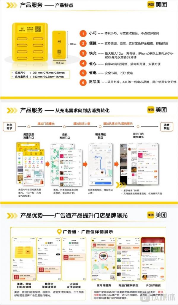 在扶持方面,像怪兽充电给予的资源较少,一般就是将主动要求投放的商家推送给代理商,其它的运营建议基本没有。而美团方面,则借助于自身在本地生活服务的优势,会在App首页上提高商家曝光率,以及在充电宝租借页面中的广告通位置对投放门店品牌进行曝光,这些也都成为代理商与商家谈判的隐性资源。