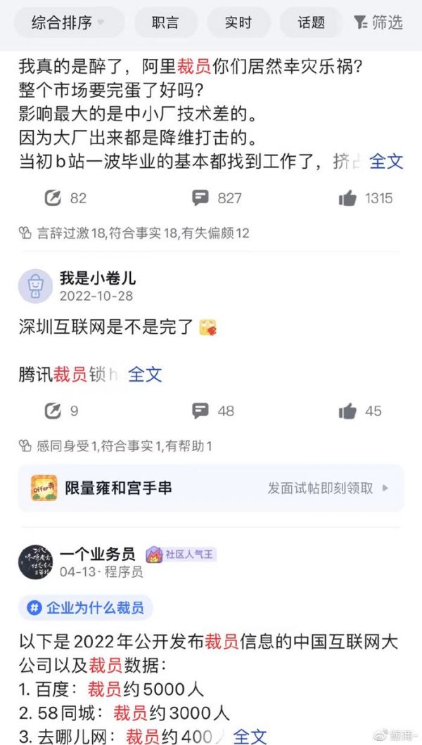 此外,国内的互联网大厂最近一直在裁员。根据相关媒体报道,腾讯一季报显示裁员了1万人,阿里更多裁员了1.9万人,OPPO旗下的自研芯片业务哲库(ZEKU)更是直接原地解散,3000人裁到一个不剩。