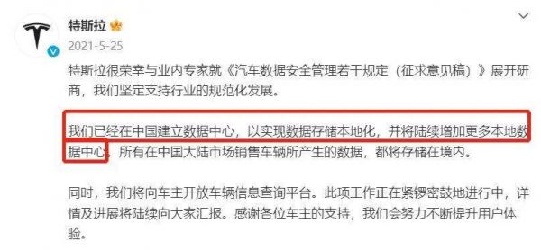 2022年3月,特斯拉表示在提交年度数据安全报告审查后,其数据安全标准已获得上海市有关部门的批准。马斯克也反复强调,特斯拉在中国产生的所有数据存储在本地,并继续扩大与监管机构的合作。