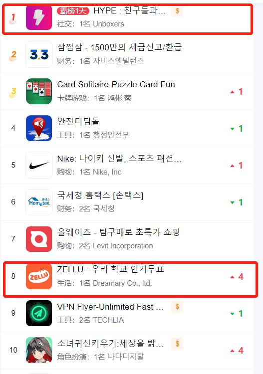 根据点点数据,4 月 23 日至 5 月 22 日的一个月内,HYPE 在韩国 iOS 下载总榜霸榜超过 10 天,另一款类似 App Zellu 成绩稍弱,但一个月内没有掉出过总榜 Top100。不过截至发稿,也只有 Hype 在韩国社交榜上依然坚挺,Zellu 成绩下落很快,看上去韩国匿名社交的热度来得快,凉得也不慢。