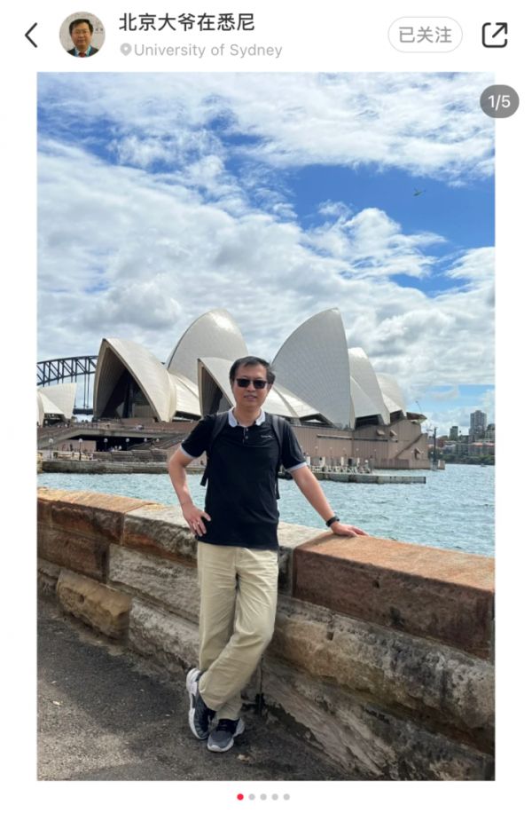 这是一张贾大明前几个月发到网上的照片。姿态潇洒,背后是悉尼歌剧院,看上去就是位旅游中还挺潇洒的叔叔。