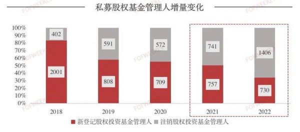 另一方面,出清速度也在加快。根据中基协发布的统计数据,2022年注销私募管理人2217家,其中包含1406家私募股权/创业投资相关管理人,但同时新登记股权投资基金管理人仅有730家。在注销的这1406家管理人中,主动注销管理人数量为2021年同期的2.2倍。