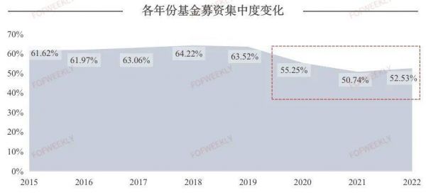 可以发现,在2019年之前,募资集中度都稳定维持在60%的水平(该比值可以理解为平均每10只基金由6个GP来管理),在2019年之后,募资集中度开始明显下滑,近2年已经跌至50%的水平,整体跌幅为16.7%,也就是说在2019年之后,当市场新增10只基金,本应该由6个GP来消化的新增资金量变成了由5个GP来消化。