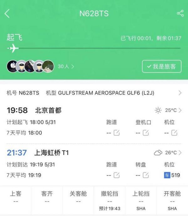 【马斯克私人飞机已从北京起飞 前往上海】5月31日晚,据“飞常准”APP显示,19时58分,特斯拉CEO马斯克的私人飞机(注册号:N628TS)已经从北京首都机场起飞,前往上海虹桥机场,预计落地时间为21时37分。