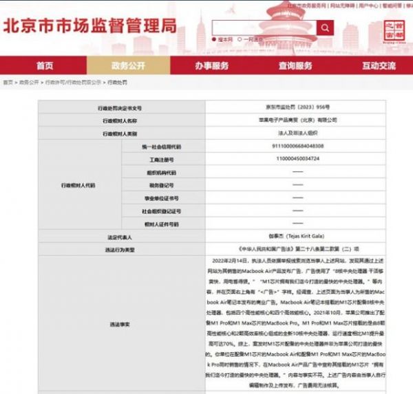 据悉2022年2月14日,执法人员依据举报线索浏览当事人上述网站,发现其通过上述网站为其销售的Macbook Air产品发布广告,广告使用了“8核中央处理器 干活够爽快,用电省得狠。”“M1芯片拥有我们迄今打造的最快的中央处理器。”等内容,并在页面右上角有“”字样。