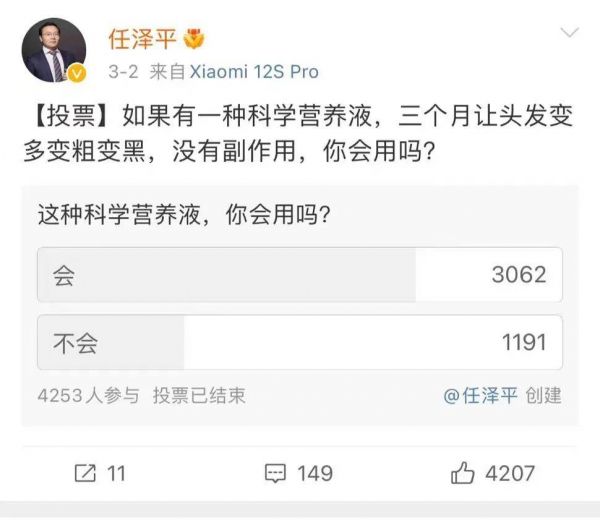 可以看到,自今年2月以来,任泽平隔三差五以文字描述或投票形式为其生发剂造势,并多次晒出自测后的对比照,赞扬使用产品后“头发长势喜人”。