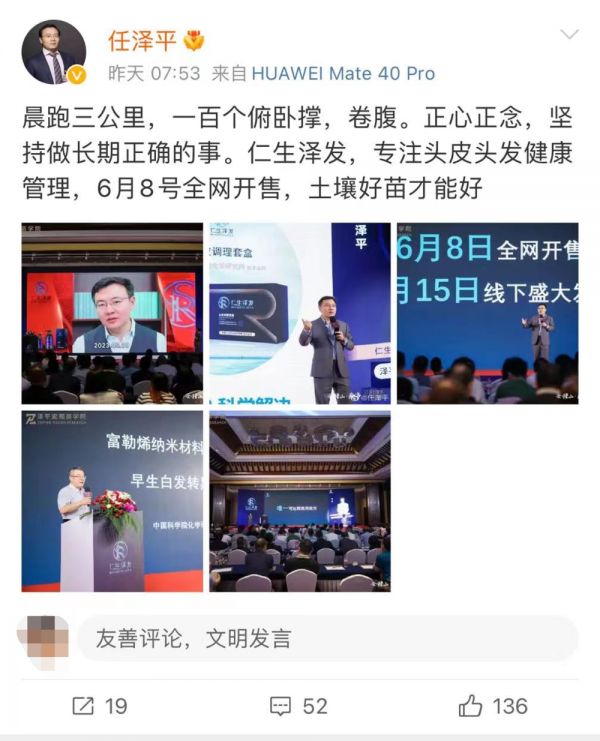 5月29日,任泽平正式在其微博高调发文带货。他表示,“任生泽发,专注头皮头发健康管理,6月8日全网开售,土壤好苗才能好。”