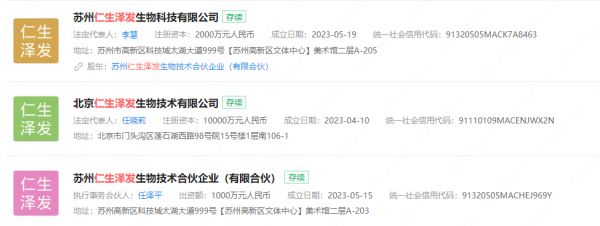 记者搜寻企查查发现,“仁生泽发”关联了3家公司,分别是:北京仁生泽发生物技术有限公司(简称“北京仁生泽发”)、苏州仁生泽发生物技术合伙企业(有限合伙)、苏州仁生泽发生物科技有限公司。